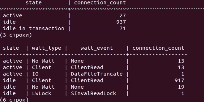 Давайте чуть углубимся в проблему. На видео ниже показан результат вывода простого скрипта к pg_stat_activity, с помощью которого можно без установки дополнительных расширений диагностировать некоторые проблемы при больших нагрузках
