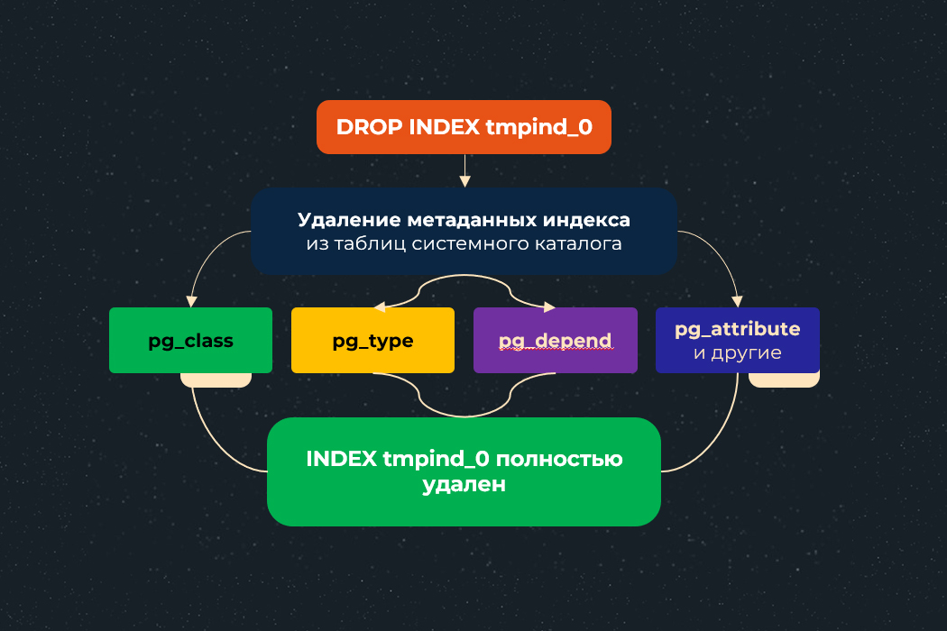 Чтобы удалить индекс, необходимо также очистить из таблиц системного каталога информацию о нем, например: