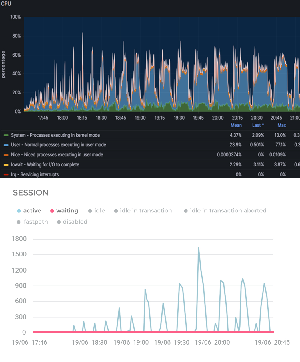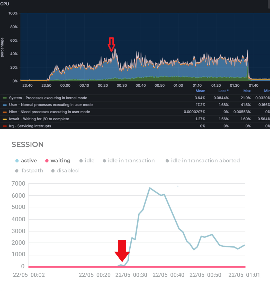 На графиках можно увидеть, как это было: процессор не уходил в утилизацию на 100%, но количество активных сессий на СУБД резко росло до нескольких тысяч пока не упиралось в max_connections. Обработка запросов стала занимать секунды вместо миллисекунд – конечно, с таким поведением тест успешно не завершишь.