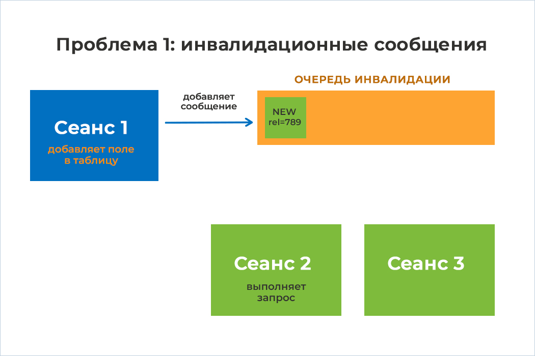 3) Сеансы 2 и 3 пока не знают, что в какую-то таблицу было добавлено новое поле. Чтобы уведомить их об изменении метаданных, существует очередь инвалидации. После добавления нового поля Сеанс 1 помещает в эту очередь сообщение об изменении метаданных соответствующей таблицы