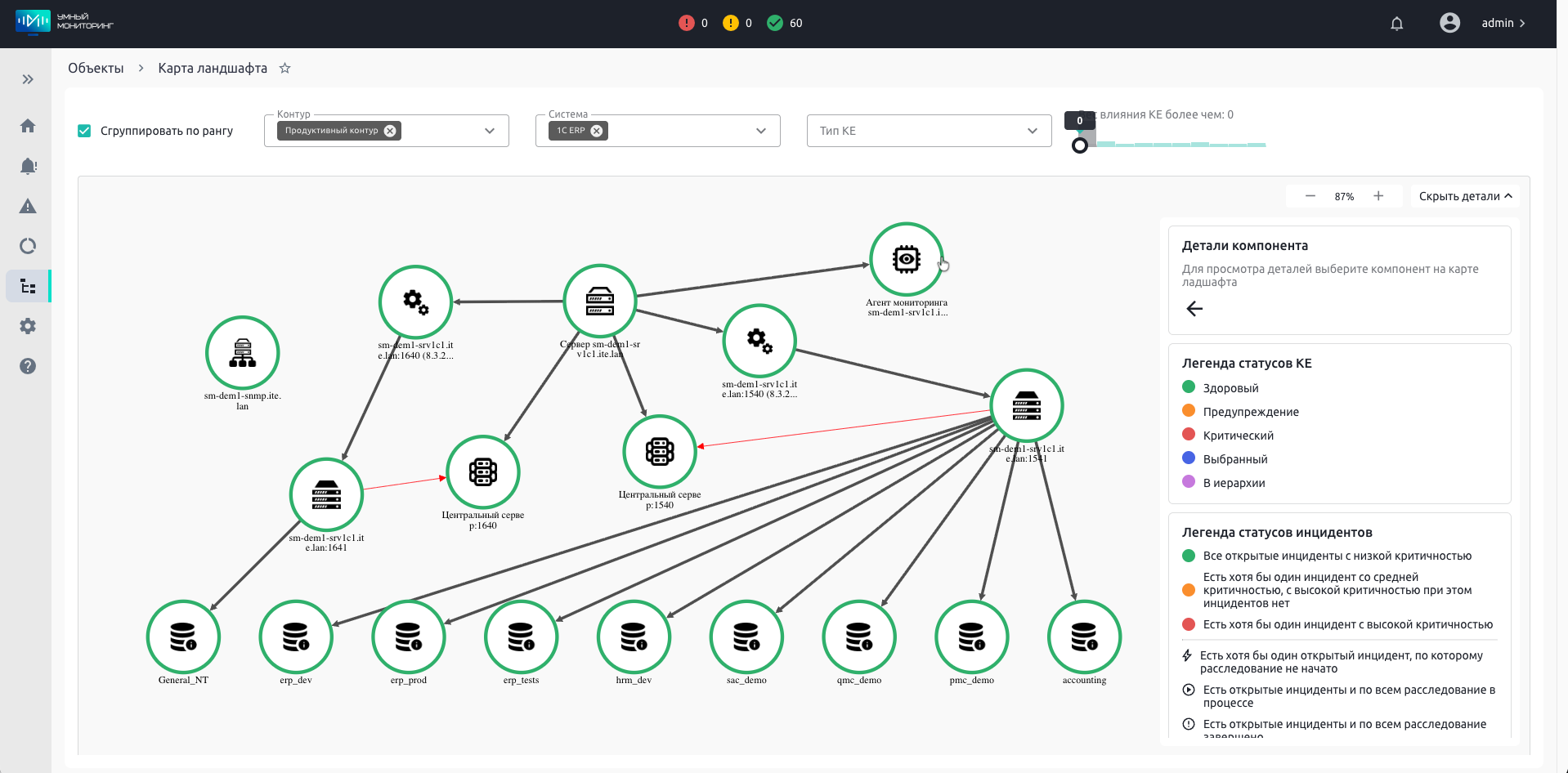 Все это позволяет существенно ускорить работу администратора, так как ему не нужно вручную вносить десятки объектов в систему мониторинга. А при любых изменениях в инфраструктуре, например, добавлении нового сервера или информационной базы, карта ИТ-ландшафта обновится автоматически.