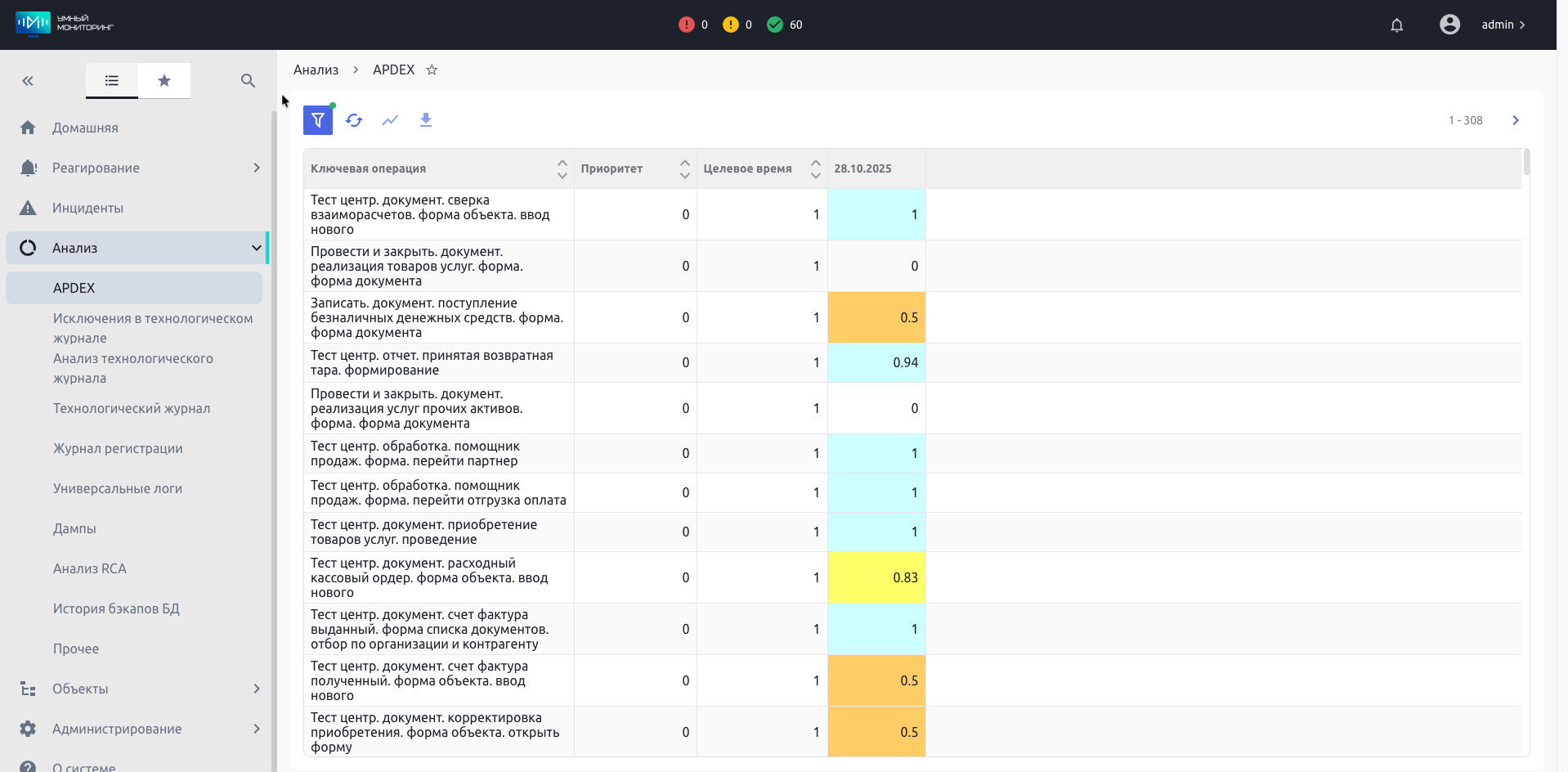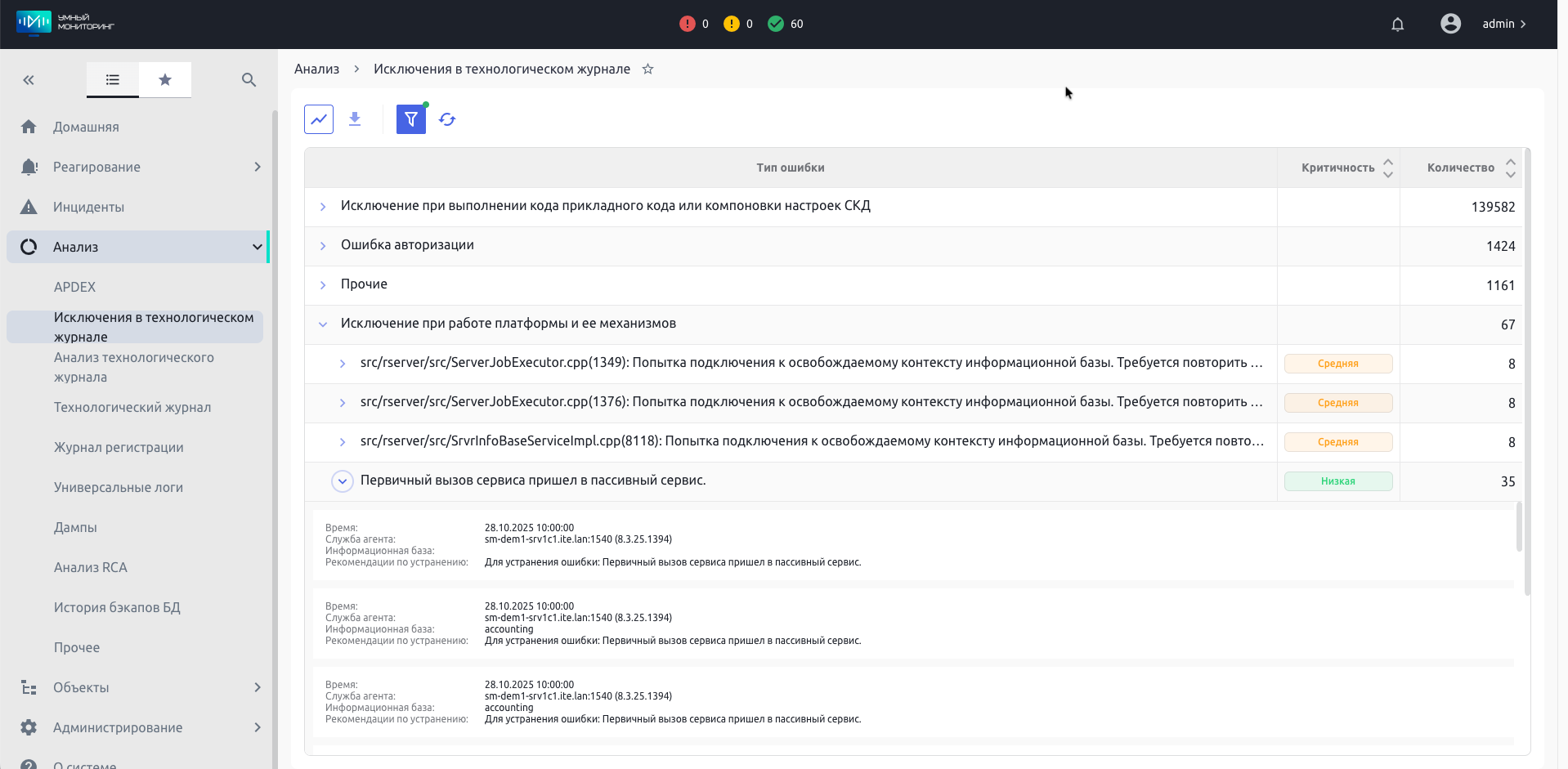 Специализированные формы для углубленного анализа. Помимо общих дашбордов, в «Умном мониторинге» есть быстрые формы для работы с конкретными данными. Например, просмотр исключений ТЖ 1С – окно, где сразу после загрузки журнала отображается список проблем со ссылками на рекомендации по их устранению. Или мониторинг APDEX, который отслеживает бизнес-метрики и выгружает информацию по ключевым операциям.