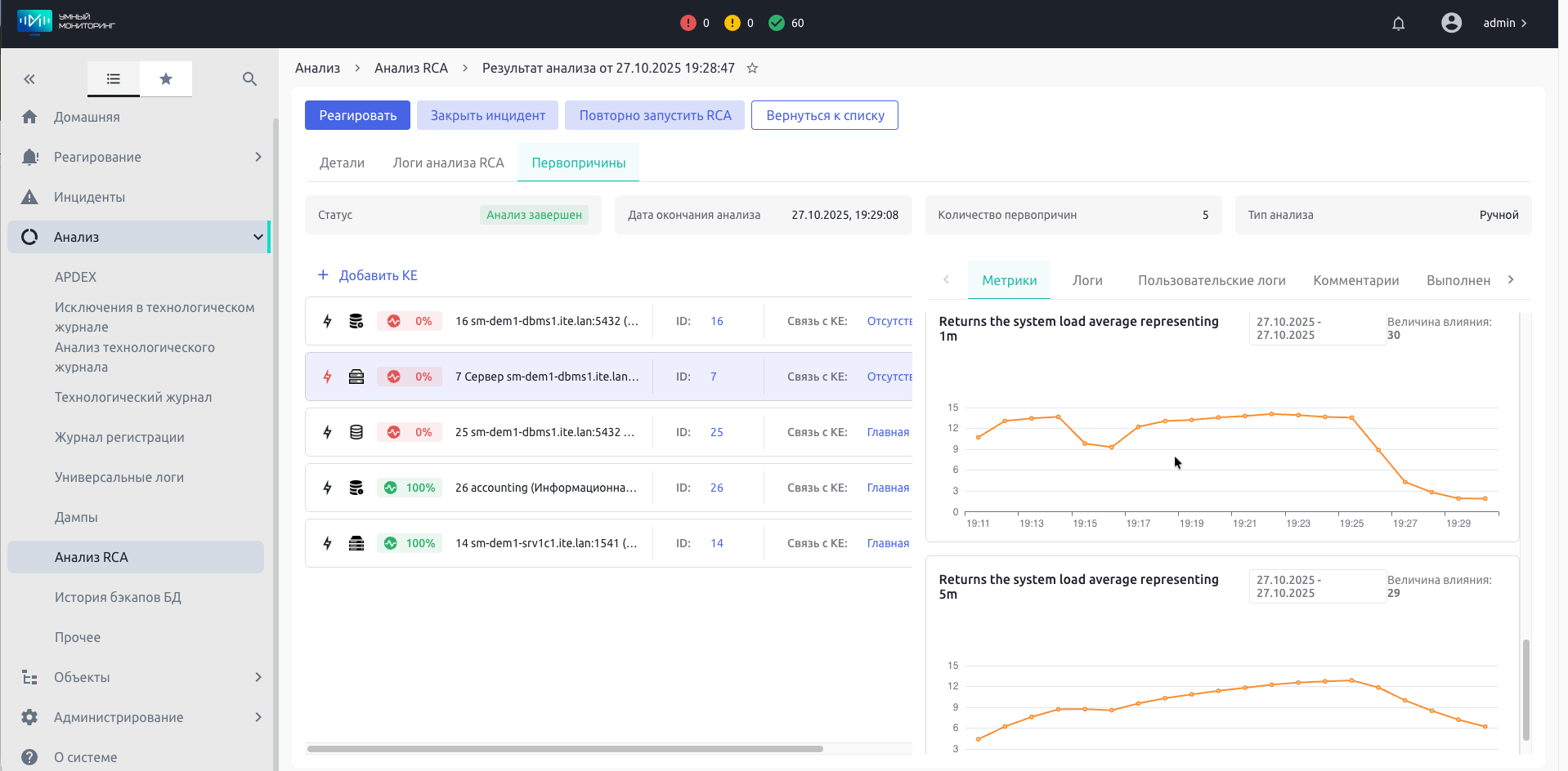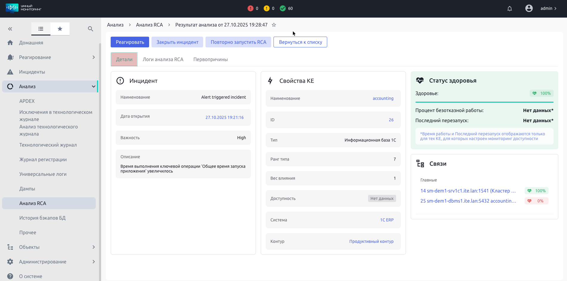 Запуск RCA (Root Cause Analysis): сработавшее оповещение у дашборда может запустить механизм поиска корневой причины. Это позволяет администратору не гадать, а сразу перейти к проблемному узлу: например, проблема возникла не на сервере кластера «1С:Предприятие», а на сервере СУБД. Подробнее о возможностях ИИ-модуля RCA расскажем далее.