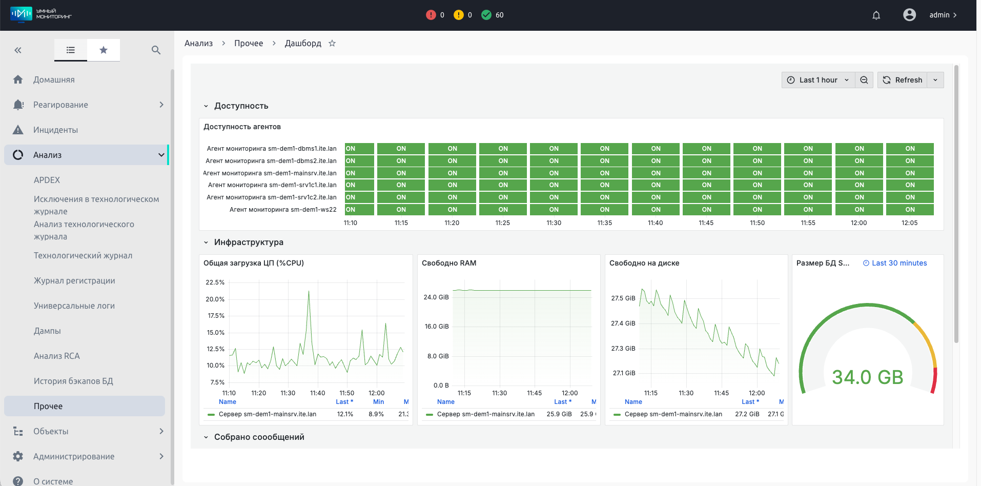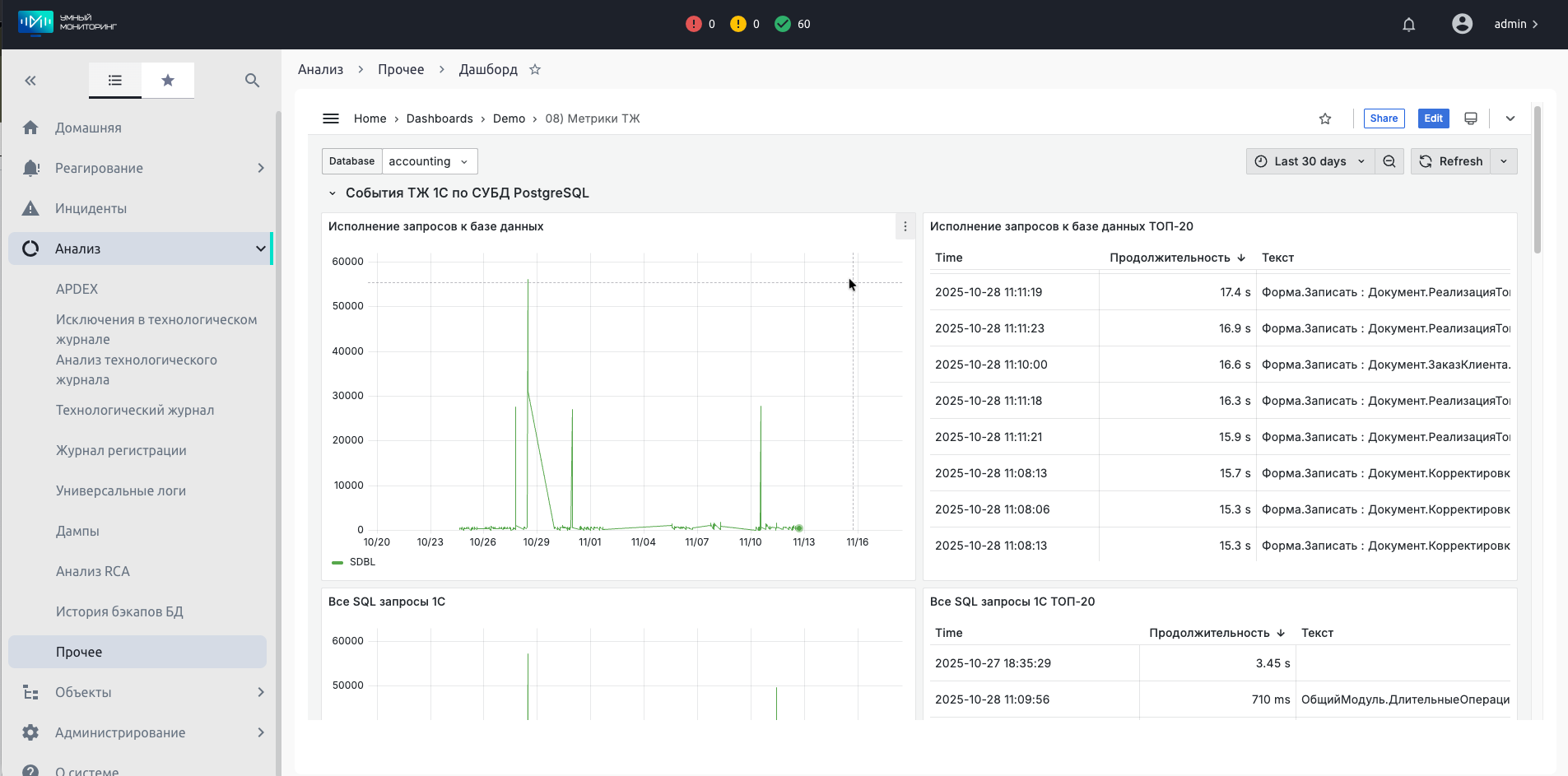 Таким образом, дашборды в «Умном мониторинге» – это не просто статичные графики, а центральный узел для наблюдения, анализа и оперативного реагирования на проблемы в экосистеме 1С, и связанных с ней ОС и СУБД. Они существенно экономят время администратора за счет автоматизации сбора данных, наглядной визуализации и интеграции с механизмами алертинга и поиска первопричин.